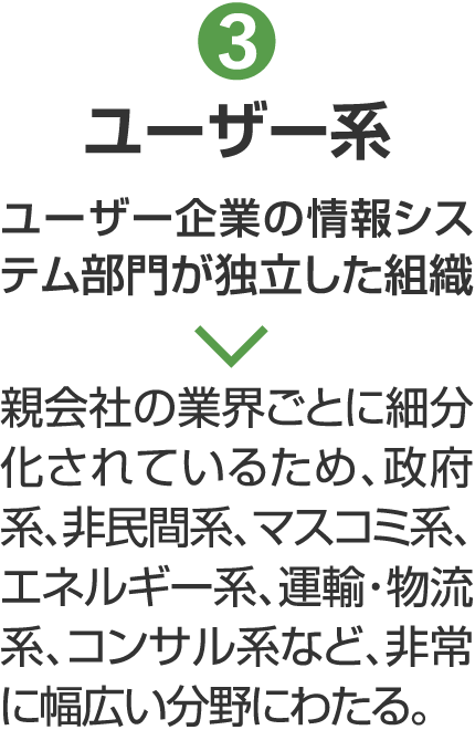 情報サービス産業には、企業の資本系列(母体)によって3つのグループがあるといわれており、経営方針や事業展開はグループによって異なります。